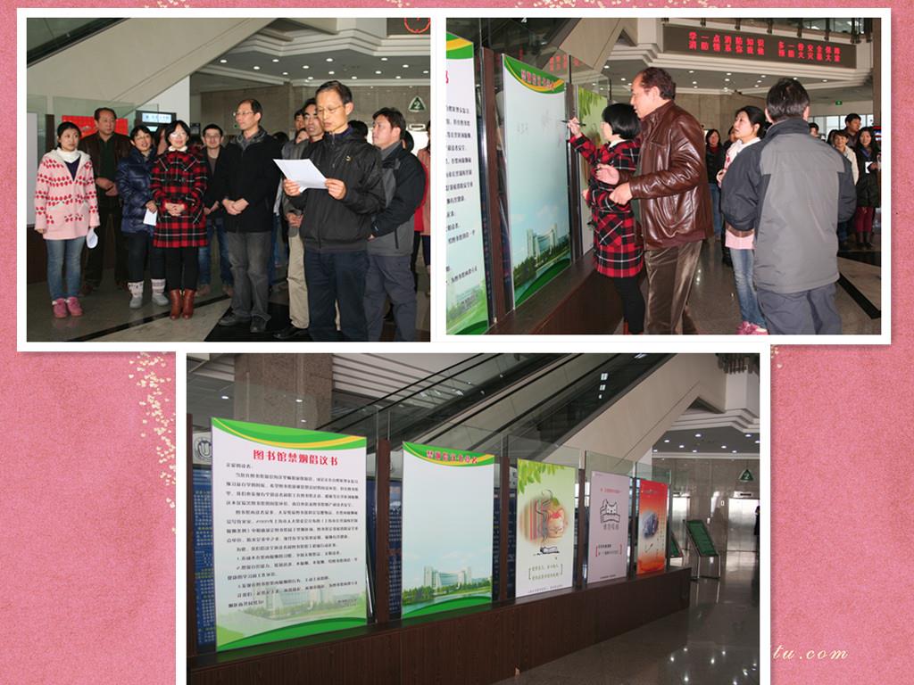 12月11日下午在图书馆二楼大厅,图书馆党员志愿者举行了禁烟劝阻活动启动仪式,图书馆党总支陆铭书记宣布图书馆党总支党员志愿者禁烟劝阻活动启动,随后党员志愿者代表鲍国海老师宣读禁烟倡议书,图书馆陆铭书记、刘华副馆长党总支委员梁建、王玉富、卢志国老师给党员志愿者挂上有党徽标志的志愿者胸牌,党员志愿者纷纷在倡议书签上自己的名字。