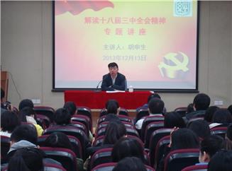 学习好、宣传好、贯彻好党的十八届三中全会精神,是当前和今后一个时期首要政治任务。经济学院积极组织开展党的十八届三中全会精神宣讲活动,努力营造在学院广大师生中学习贯彻党的十八届三中全会精神的良好氛围。此次讲座活动,将有助于学院师生更好地理解和领会党的十八届三中全会精神的实质和内涵,并将学习贯彻党的十八届三中全会精神融入到自己的各项工作学习中。