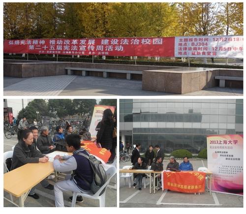 今年是“六五”普法中期检查督导之年,也是上海市宪法宣传周确立25周年。为大力宣传党的十八届三中全会精神和以宪法为核心的中国特色社会主义法律体系,深入推进“六五”普法工作和建设法制学校的进程以及进一步提高全体师生的宪法意识和法治观念,以“弘扬宪法精神,推动改革发展,建设法治校园”为主题的2013年度365完美体育宪法宣传周活动于12月5日在校本部益新楼前广场成功举办。