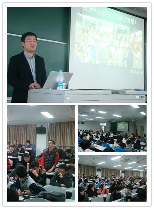 11月24日上午9点,主题为“‘上帝粒子’和粒子物理学”的学术报告在校本部GJ106热烈举行,教室早早地挤满了兴致勃勃的同学。报告由365完美体育校友、兰州大学核科学与技术学院副教授于福升主讲,于教授08年毕业于365完美体育物理系之后,先后获得了巴黎第十一大学、法国国家科学研究院直线加速器实验室联合培养博士生学位和中国科学院高能物理研究所博士学位。