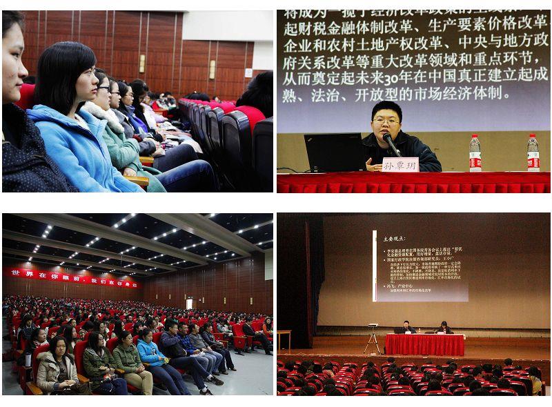 报告伊始,孙老师阐述了本次讲座的基本内容和重要意义,并直言,利用首日教育的时机商科学生共同学习的必要性。随后,她介绍了十八届三中全会召开的背景,指出在如今中国的迅速发展和转型的关键时期,本届三中全会被认为是十一届三中全会后最重要的一次会议,将关系到中国未来五到十年的命运,同时,国家在经济方面的改革措施也与在座大学生的未来道路和选择方向息息相关。