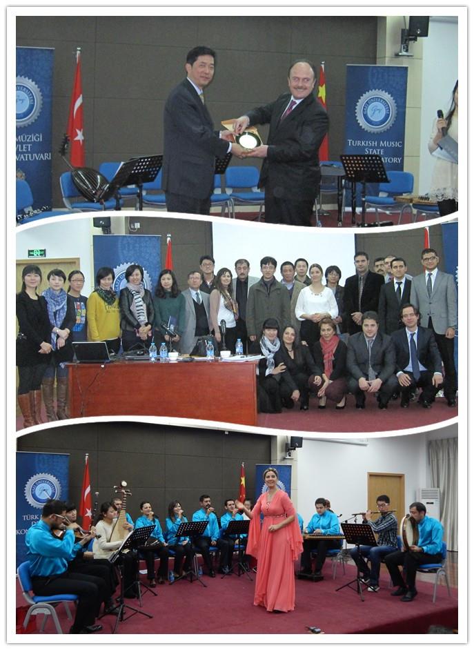值此2013年中国的“土耳其文化年”之际,在土耳其文化旅游部,土耳其驻上海总领事馆的支持下,土耳其安卡拉伽兹大学(Gazi University)音乐学院派遣代表团于11月21日访问了我校,举办讲座及音乐会,并与我校音乐学院的教师和民乐团成员开展交流研讨,从而促进了两校在音乐艺术方面的交流。