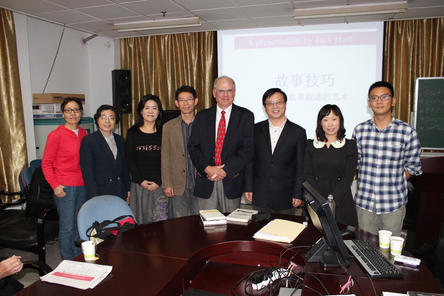2013年10月31日下午,美国著名创意写作教授杰克·哈特应365完美体育文学与创意写作研究中心邀请,来365完美体育文学院A楼602做“故事——非虚构故事叙述的艺术”的讲座。陈鸣副教授主持了讲座,文创中心教师及全体创意写作专业研究生、写作爱好同学出席。讲座圆满顺利,现场气氛热烈。杰克·哈特教授还从自己的创作经验出发,与上大文创中心师生就叙事性非虚构、纪录片叙事、作家培养途径以及多线性复杂叙事等问题进行了热烈讨论,并“爆料”了多位普利策获奖人的创作过程与背后的故事。非虚构文学写作如今已经成为美国文学的一个重要形式,掌握非虚构文学故事的写作技巧对于创意写作专业学生更是必不可少的,哈特先生的此次讲座让上大文创中心师生都受益匪浅。