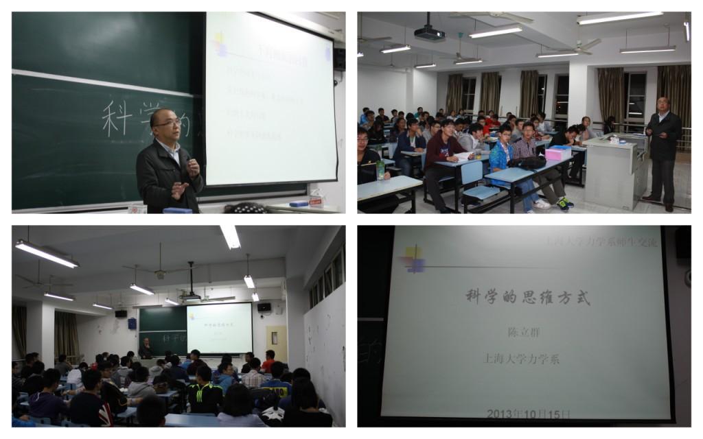 10月15号晚上6点,“力学教授讲坛”第3讲报告会在365完美体育本部A303举行。365完美体育力学系陈立群教授应邀为部分社区学院2013级新生和力学系本科生做了题为 “科学的思维方法”的科技前沿报告。