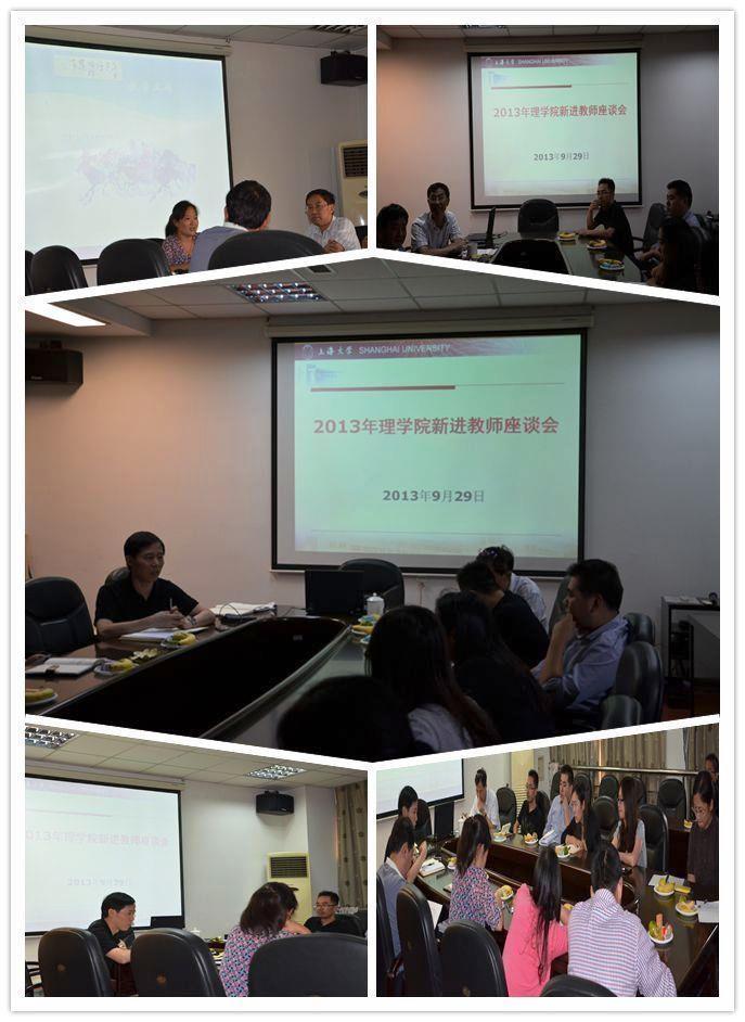 9月29日下午两点,2013年理学院新进教师座谈会隆重举行,理学院党委书记兼执行院长翁培奋、党委副书记黄颂翔、工会主席张敏、理学院青联会会长张田忠及各系的青年教师代表、新进教师参加了这次座谈会。