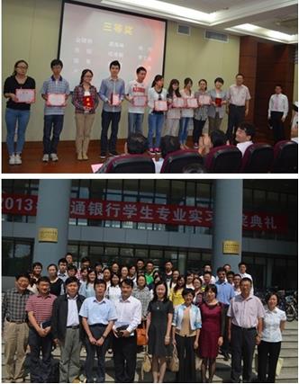 会议伊始,经济学院院长沈瑶教授和交通银行上海市分行个人金融业务部总经理李利先后发表了讲话。沈瑶院长简要回顾了交通银行上海市分行和经济学院在近几年的合作历程,对交通银行上海分行的对双方合作项目的大力支持表示衷心的感谢。最后,沈院长对获奖同学表示祝贺并表达了对他们的殷切希望。李利首先对双方合作取得的累累硕果表示欣慰,对本次实习生的实习表现给予了肯定。随后,在一段《成长-收获-感恩》的主题视频的引领下,大家一起回顾了我们这两个月的成长历程,并听取了实习生代表刘双锋同学的发言。刘双锋同学讲述了本次实习中的难忘点滴,引起了很多同学的共鸣;诚挚地表达了对带教老师们的由衷谢意,道出了许多同学的心声。接着,由院校领导王建华、汪宏斌、林海霞先后宣读了本次专业实习三等奖、二等奖、一等奖的获奖者名单,并相应地由交行领导陈煜明、俞津波、罗晓为获奖者颁奖留念。之后,获奖者代表侯丹文同学发表了获奖感言,她在发言中简述了自己在两个月的实习中的成长、收获和感悟,深情回顾了交行老师寄予的关怀和照顾,并由衷地表达了对交行老师的深深谢意。