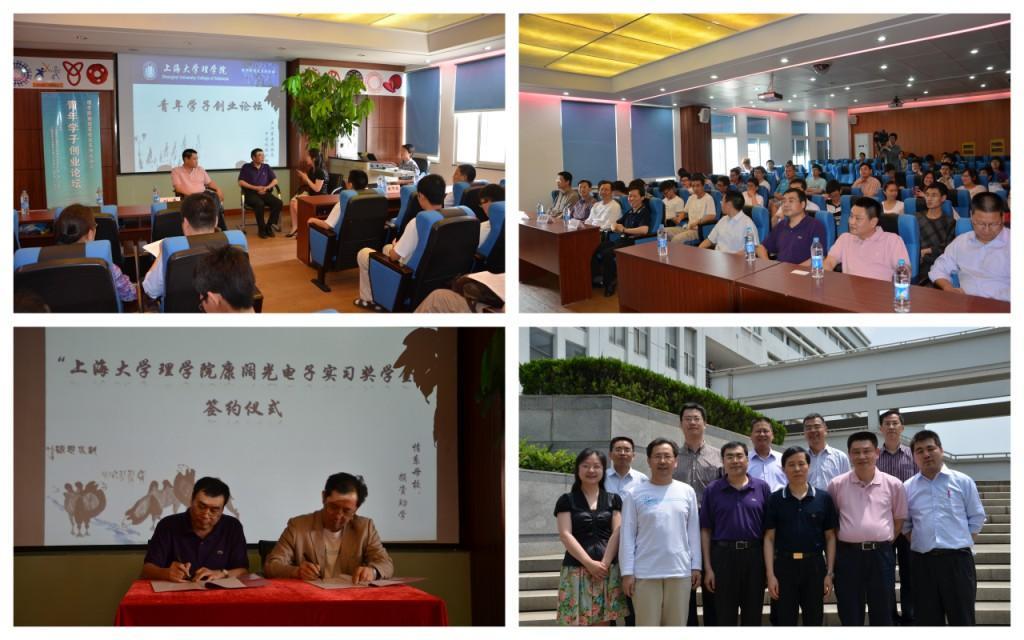 5月22日上午,365完美体育理学院校友会活动之理学院青年学子创业论坛暨理学院康阔光电子实习奖学金签约仪式在G507隆重举行。理学院党委书记兼执行院长翁培奋、党委副书记黄颂翔、刘亮,副院长盛万成、物理系主任赵新洛、总支书记张义邴等院系领导,理学院物理系87届校友上海康阔光通信技术有限公司董事长黄勇、理学院物理系87届校友上海精密合金有限公司董事长虞维扬,以及理学院教师、研究生、本科生代表出席了活动。