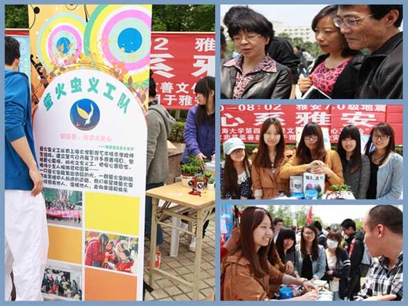 此次慈善义卖,萤火虫义工队共筹集善款1159元。据悉,此次各个义工队所筹集的善款都将捐献给雅安,为灾区的人们带去上大学子的一份爱心!