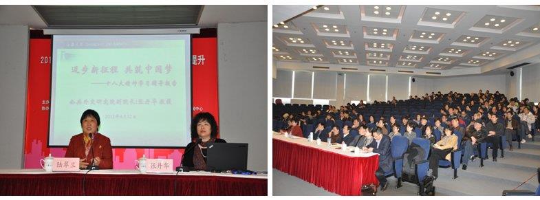报告会上,张丹华教授从高等教育在实现中国梦中扮演的角色入题,围绕十八大“举什么旗、走什么路、以什么样的精神状态、实现什么样的目标”的主线,详细解读了党的十八大对教育的新部署、新要求。随后,张教授结合相关数据和案例,展现了我国教育现状在世界教育体系中的坐标,并就高等教育内涵式发展、社会主义核心价值体系构建、协同发展模式、科学技术发展现状以及外媒的评价等热点问题做了介绍。最后,结合我校的发展目标,她说国家的发展和十八大精神为我们提供了精神动力和奋斗目标,教育工作者要保持清醒的头脑,抓住难得的机遇期,在目标和现实之间,努力奋进,多做贡献。