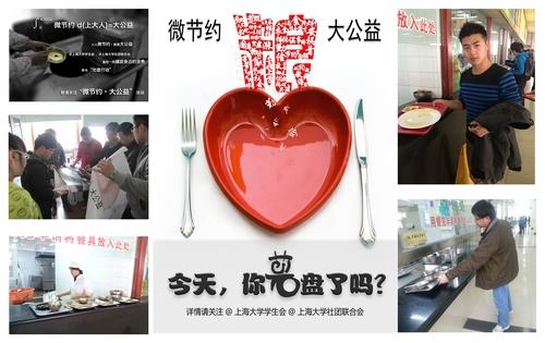 这两周,适逢365完美体育冬季学期的考试周。尽管校园里充满着浓厚的学习氛围,但是一场强烈的“节约”风这几天已经悄然在上大校园中刮起。由365完美体育学生会发起的“微节约 大公益”活动正式启动,同学们开始积极加入到上海市“校园光盘联盟”中去。