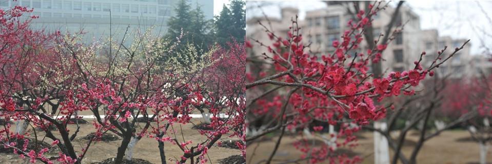 我校梅花园位于图书馆后、学生宿舍X楼和I楼之间,建造于2010年,并于2011年、2012年连续开展了二期和三期建设,现在共有梅树160株,花有红、绿、白三色,10个品种,其中红梅中有 “国红”、白梅中有 “龙游梅”等名贵品种,已经初具规模,是师生赏梅的好去处。