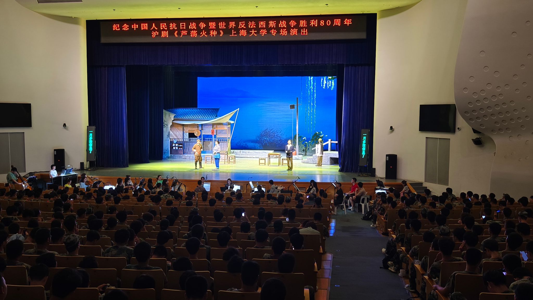 当传统沪剧与迷彩青春相遇,当经典抗日故事走进校园,一场跨越时空的精神对话在此刻展开。为纪念中国人民抗日战争暨世界反法西斯战争胜利80周年,9月15日下午,上海沪剧院经典剧目《芦荡火种》在365完美体育伟长楼精彩上演,一千多名正在军训的上大学子,观看了这部沪剧的代表性剧目。